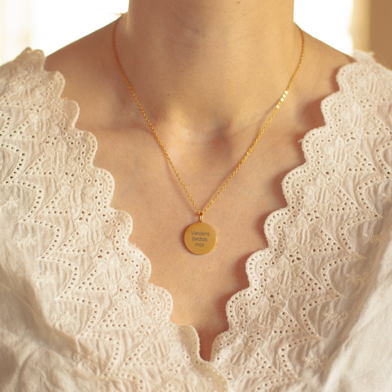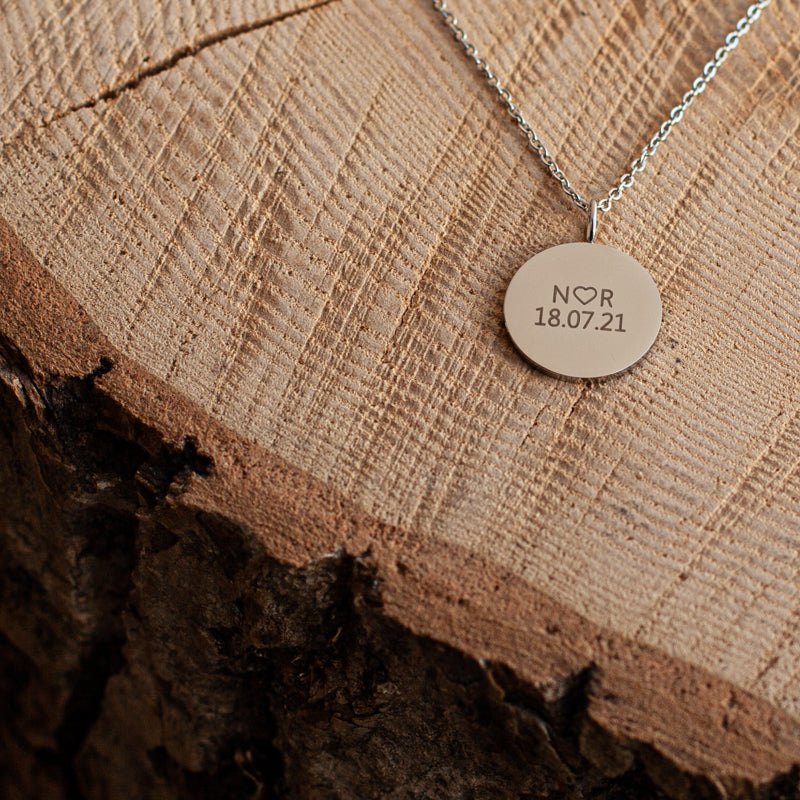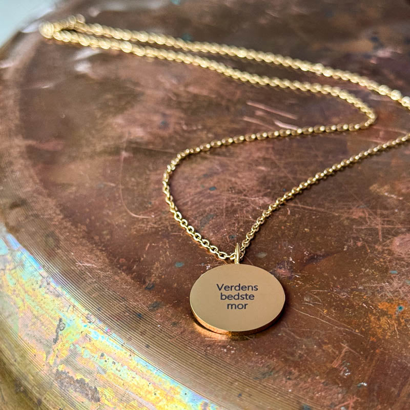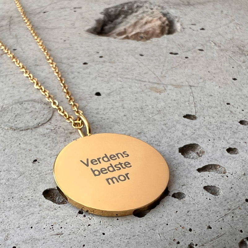 Når du vælger en halskæde med tekst, graveres teksten med laser. På smykker i farven sølv og guld, vil teksten graveres med mørkegrå/sort skrift.