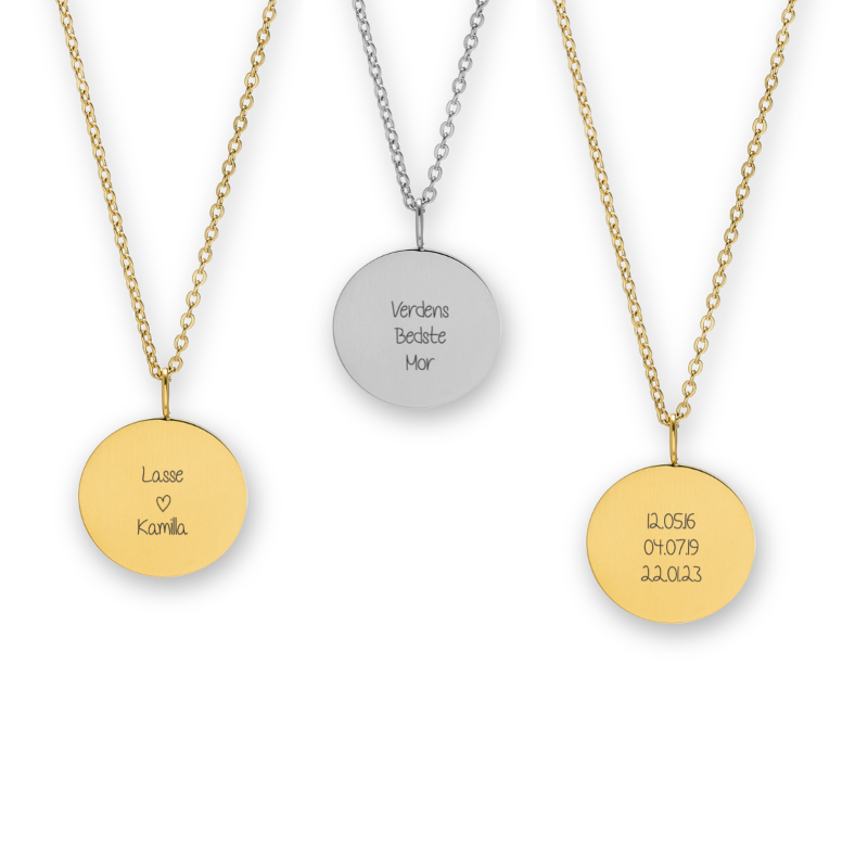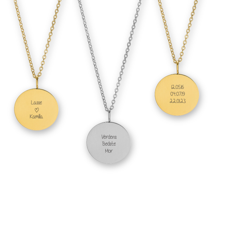 Når du vælger en halskæde med tekst, graveres teksten med laser. På smykker i farven sølv og guld, vil teksten graveres med mørkegrå/sort skrift.