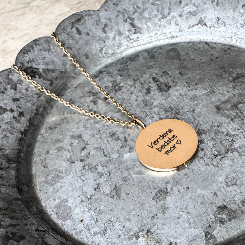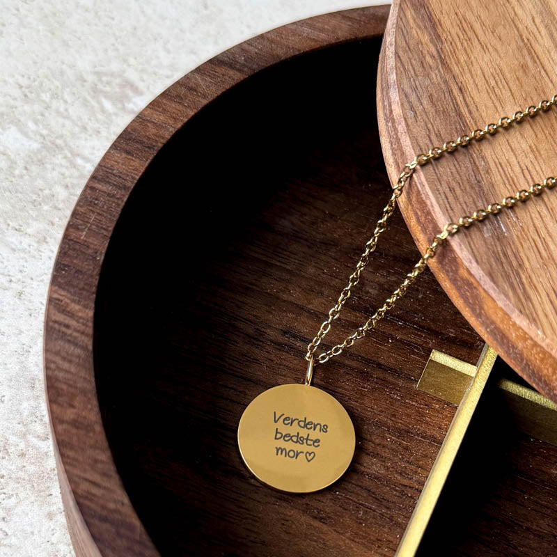En enkel halskæde med rundt vedhæng. Du vælger helt selv, hvad der skal graveres på vedhænget. Teksten på armbåndet graveres med en skrift, som minder om håndskrift.