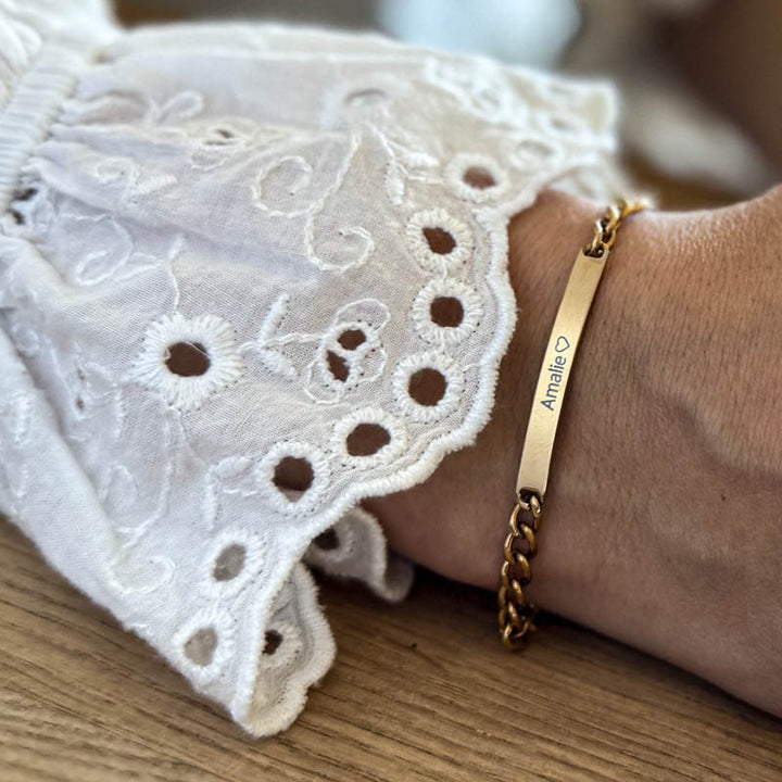 Et enkelt armbånd, med mulighed for personlig gravering. Du vælger helt selv, hvad der skal graveres på armbåndet samt om du vil have tekst på en eller to sider.